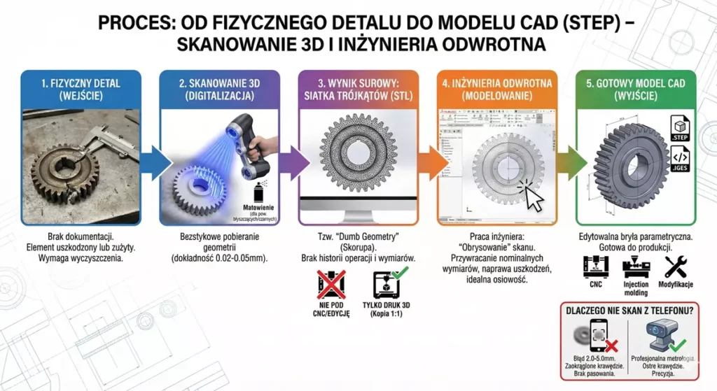 - Ograniczenia: Pliku ze skanera nie można łatwo edytować w programach typu SolidWorks czy Inventor. Nie ma on historii operacji, wymiarów ani zdefiniowanych otworów. Można go wydrukować na drukarce 3D (kopiowanie 1:1), ale nie można go wyfrezować na CNC ani zmodyfikować wymiarowo bez dalszej obróbki.